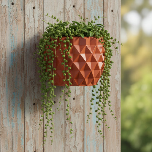The "Prizma" Wall Planter features a cylindrical profile defined by a faceted geometric surface. Repeating triangular planes form a continuous pris...