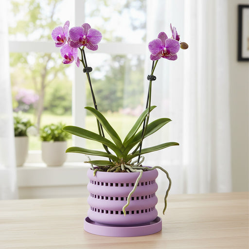 A specially designed orchid pots with ample side holes for ventilation, housing a blooming orchid. Give your orchids the perfect home with our specially designed orchid pots featuring enhanced ventilation and drainage. Each pot is engineered to ensure optimal airflow and moisture control, creating ideal growth conditions for vibrant, healthy orchids. The thoughtful design prevents root rot by mimicking the plant’s natural environment, helping your orchids thrive. These orchid planters combine functionality with elegant style, showcasing your blooms beautifully while keeping them well-cared-for.