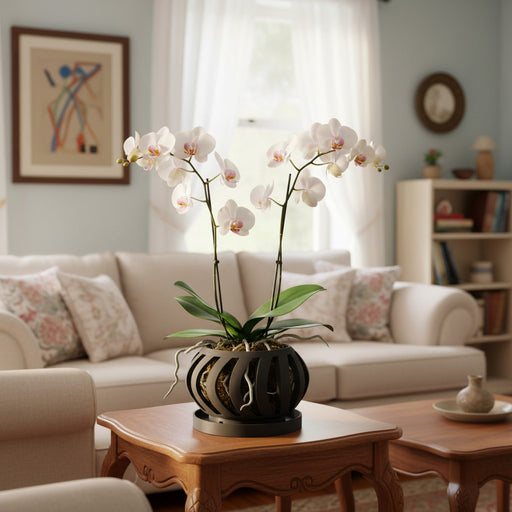 A specially designed orchid pots with ample side holes for ventilation, housing a blooming orchid. Give your orchids the perfect home with our specially designed orchid pots featuring enhanced ventilation and drainage. Each pot is engineered to ensure optimal airflow and moisture control, creating ideal growth conditions for vibrant, healthy orchids. The thoughtful design prevents root rot by mimicking the plant’s natural environment, helping your orchids thrive. These orchid planters combine functionality with elegant style, showcasing your blooms beautifully while keeping them well-cared-for.