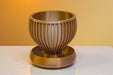 This 3D printed planter is a sculptural embodiment of rhythm and balance, defined by its seamless vertical ribbing that traces the silhouette from a slender cylindrical foot into a generously rounded bowl. Each rib creates a subtle play of light and shadow, enhancing the dynamic sense of movement across the surface. The bowl's volume expands elegantly, maintaining perfect proportional symmetry, while the finely crafted ridges introduce a tactile richness that invites close examination. The planter's opening is framed by a clean, thickened rim, creating a strong yet refined boundary that mirrors the solid base below. The matching detachable saucer echoes the curvature of the main form, grounding the design visually without interrupting the vertical flow. The surface texture reveals the intentional layering of the 3D printing process, adding a nuanced linear grain that complements the vertical pleats. The entire form feels buoyant yet stable, with a sculptural quality that captures both modern minimalism and organic fluidity. This planter stands as a testament to precision design, where each contour, ridge, and expansion point is thoughtfully orchestrated to produce a visually captivating and harmonious aesthetic.