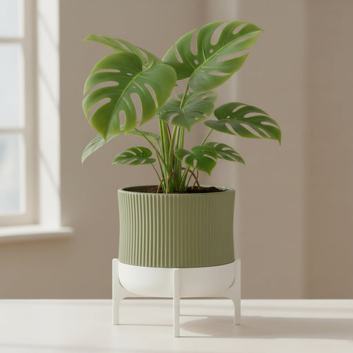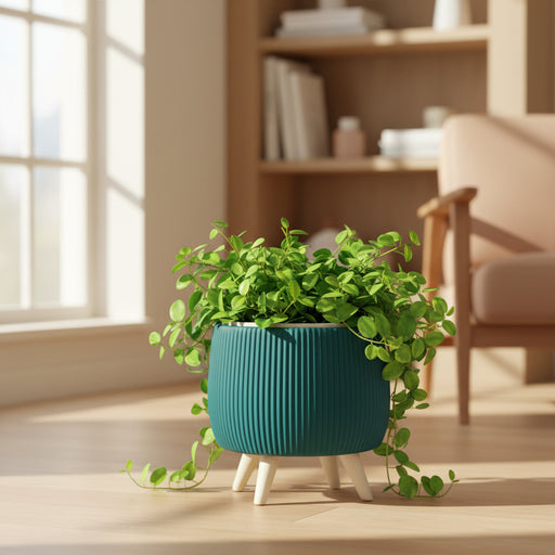 “Quadra” is a vertical-ribbed, cylindrical 3D-printed planter with legs. A compact four-leg pedestal lifts the pot for airflow and a clean mid-cent...